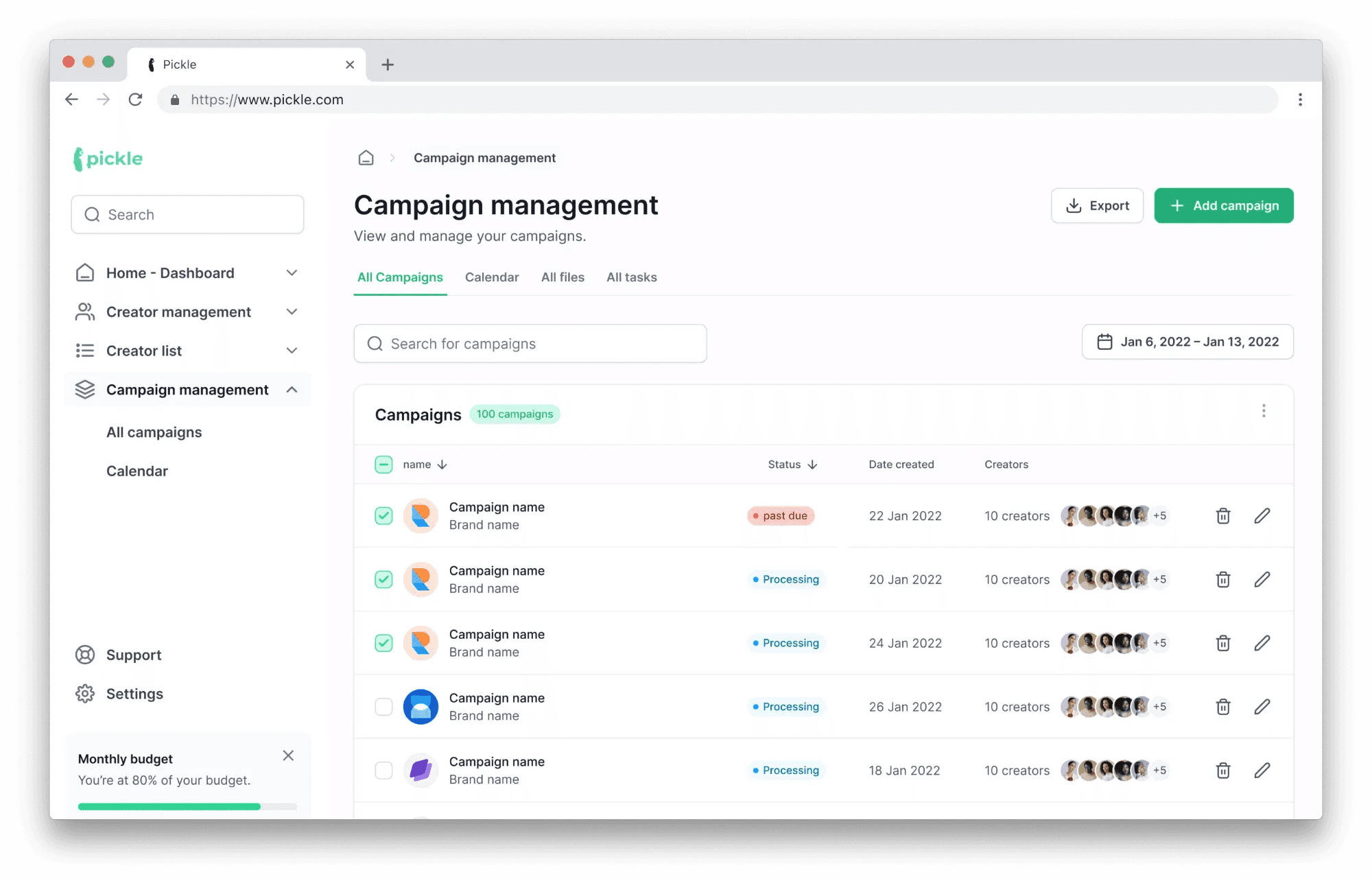 As part of Pickle’s CRM Platform, Campaign Management Dashboard integrates agencies’ different digital profiles and longitudinal influencer records, helping managers efficiently manage campaigns.