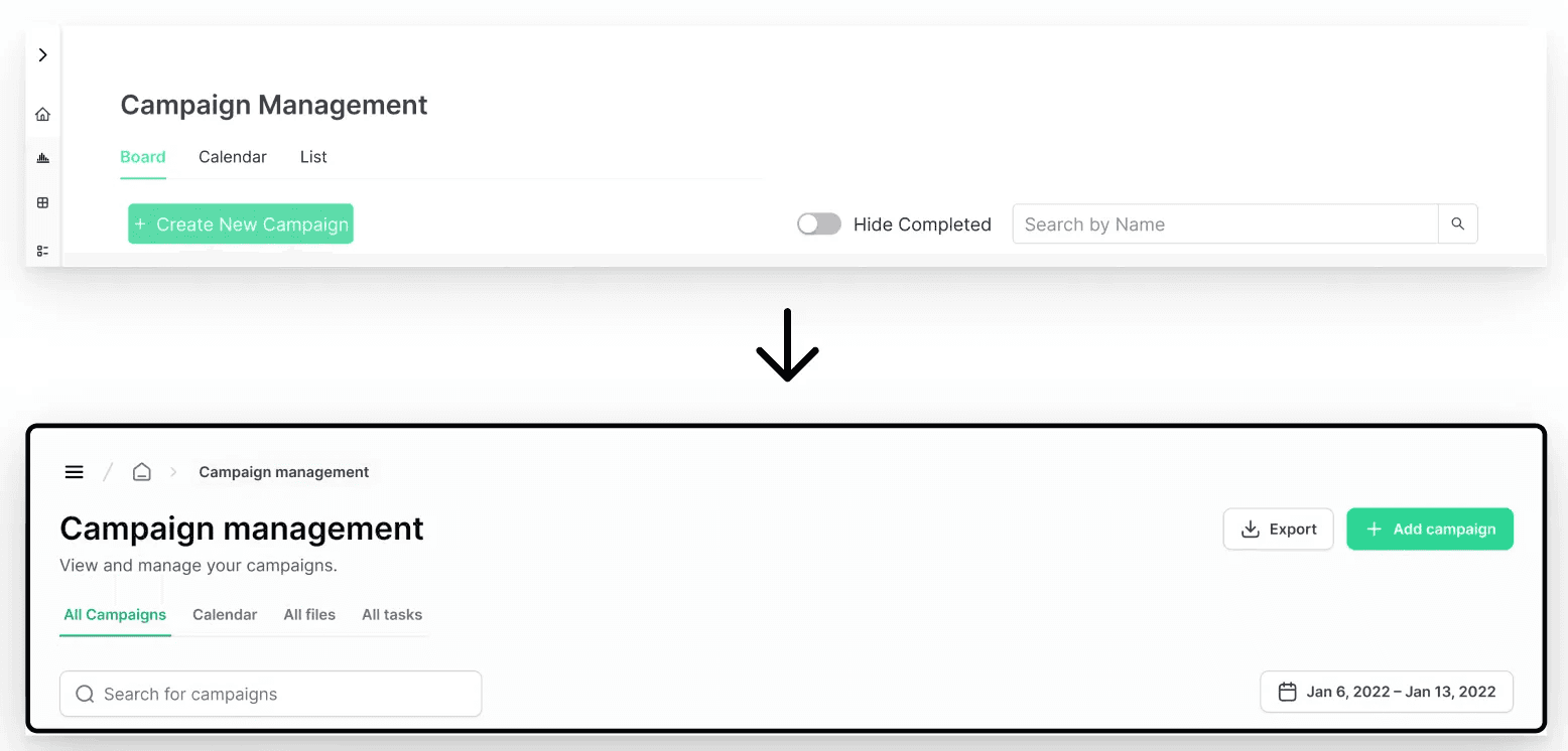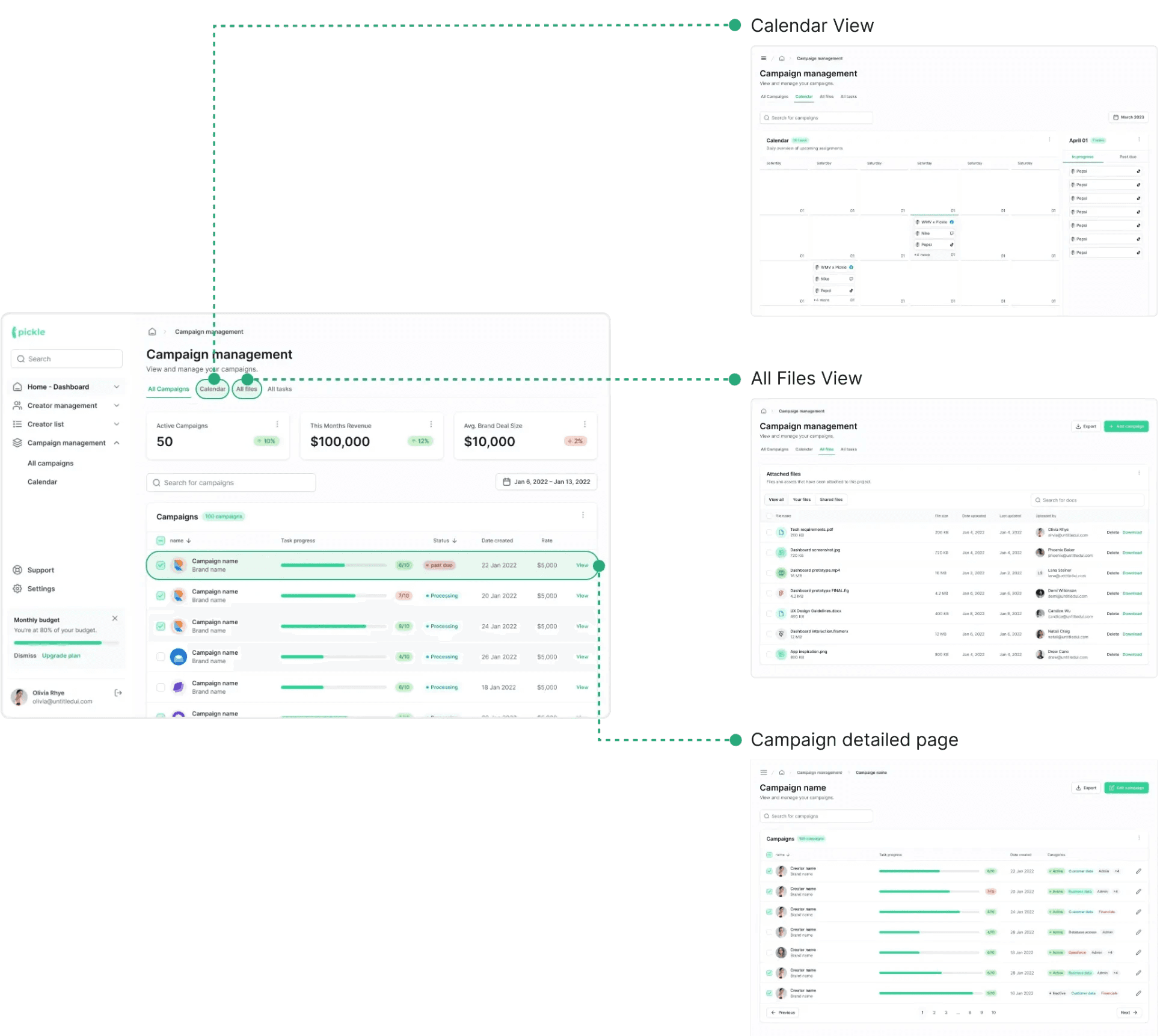 Calendar, All files, and Campaign Detailed Page